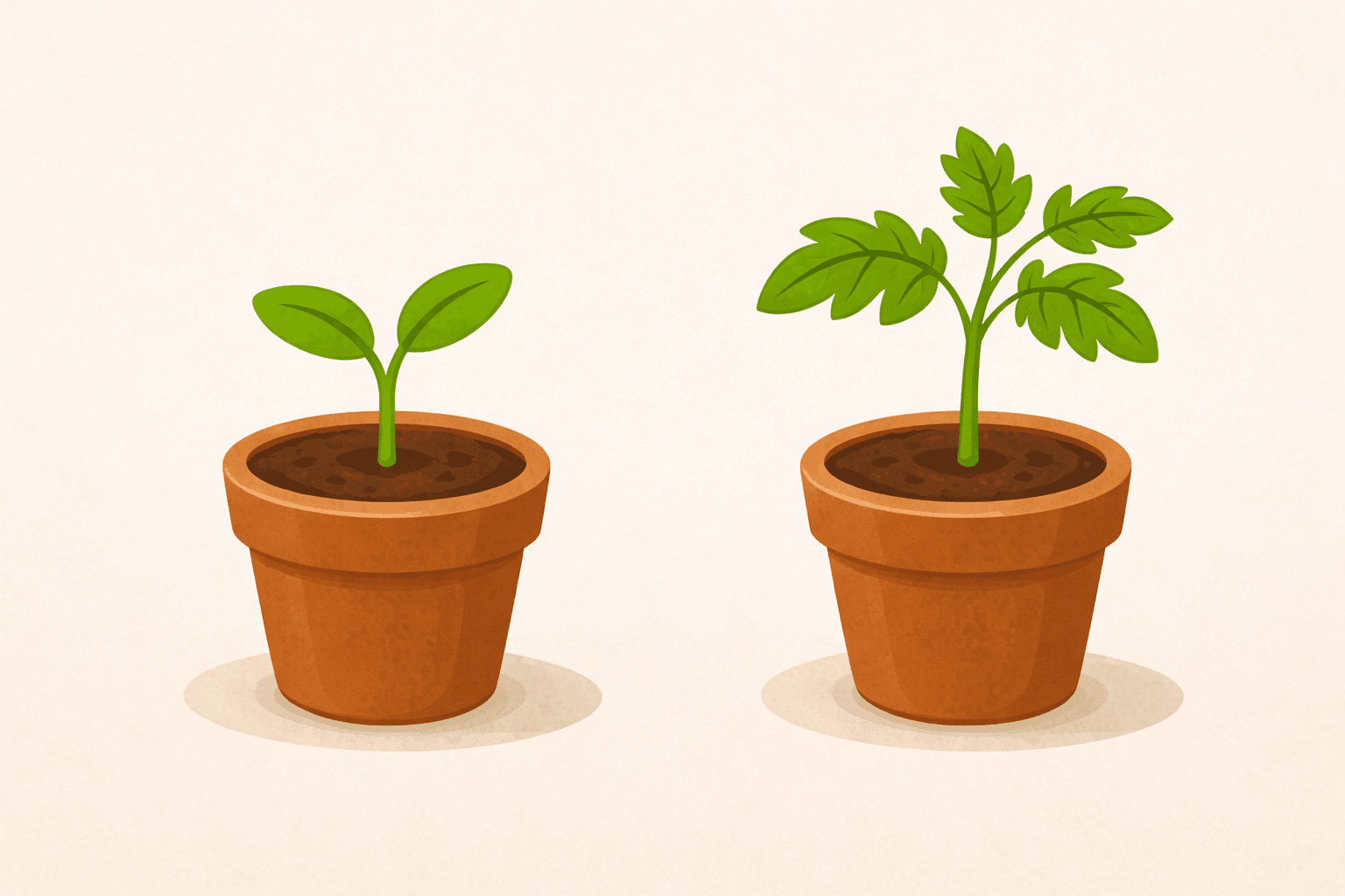 Tomatenkeimling mit Keimblättern und Tomatenpflanze mit echten Blättern im Vergleich